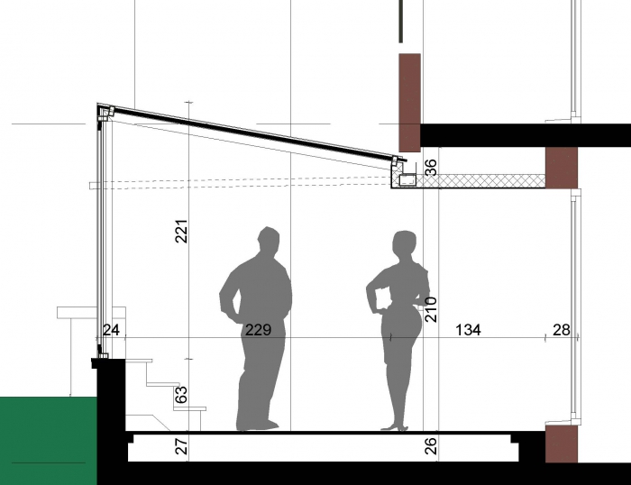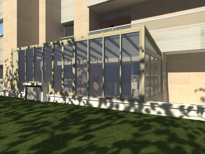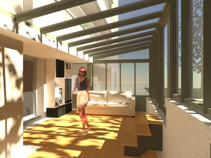Cette véranda est conçue pour offrir un prolongement sur l'extérieur à un appartement de rez-de-chaussée. La pente de la verrière accompagne l'ouverture sur le jardin, laissant derrière elle un chéneau encastré au contact de la façade pour récupérer les eaux de pluies ramenées ensuite vers le jardin par une descente d'eau intégrée aux traverses latérales. Un principe structurel simple, basé sur la répétition d'un portique unifiant la structure de la façade à celle de la toiture donne à cette construction légère sa cohérence propre, toute entière déterminée par son usage et sa situation. Le projet a malheureusement été refusé par la copropriété dans son principe même.