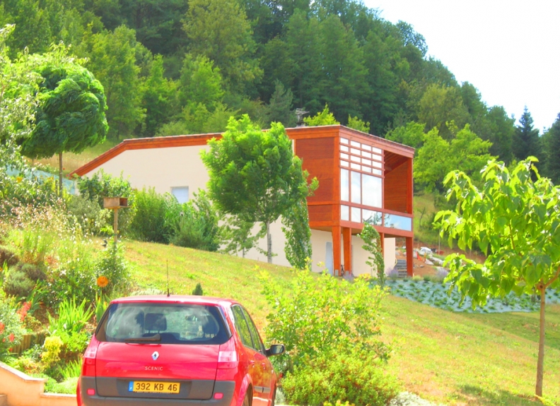 La maison est donc légèrement enfouie, dégageant la vue sur Figeac depuis l'entrée du terrain et de la voie d'accès longeant la limite sud, avant d'apparaître dans sa véritable dimension une fois atteinte l'aire de stationnement. Nous avons souhaité donner tout son relief à cette double-orientation, en articulant, par l'intermédiaire d'une volumétrie en « L » :