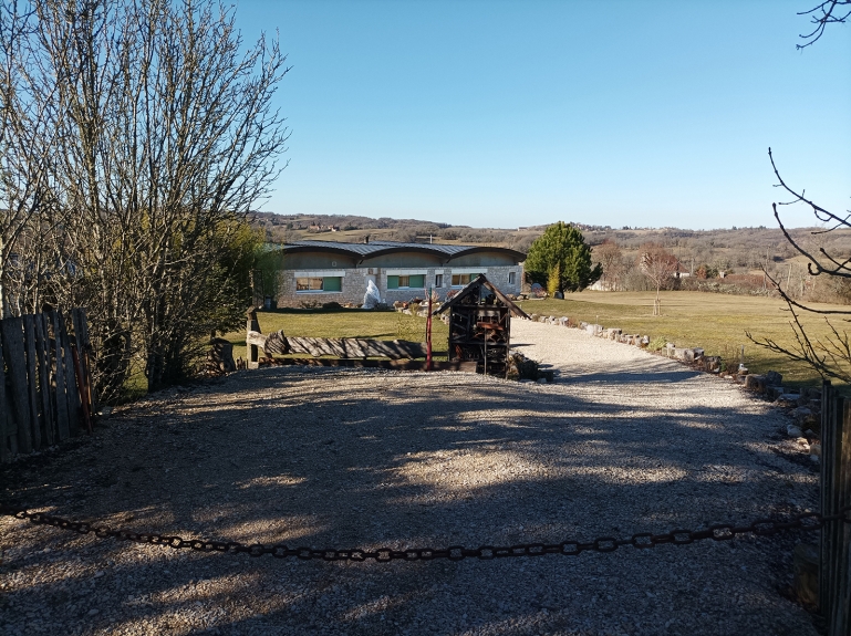 Nous avons souhaité aborder ce programme en assumant son caractère contemporain tout en trouvant des solutions architecturales susceptibles d'établir un dialogue avec l'Architecte des Bâtiments de France, le terrain se situant dans le périmètre de protection d'une petite chapelle voisine. La maison est implantée en léger contrebas sur la gauche par rapport à l'accès principal du terrain situé à l'est en partie haute. Elle est constitué d'un parallélépipède simple et bas de plein pied, d'environ 14 mètres par 18 légèrement encastré dans la pente. Elle est couverte de trois voûtes afin d'insérer avec douceur le profil de la maison dans le paysage du vallon et de retrouver une échelle commune avec les constructions traditionnelles visibles à proximité. En partie haute, les trois voûtes reposent sur un mur en maçonnerie et pierre du Causse (façade Est). En partie basse la tripartition de la toiture s'affirme plus nettement par le principe d'un portique protégeant un espace extérieur abrité (façade Ouest).